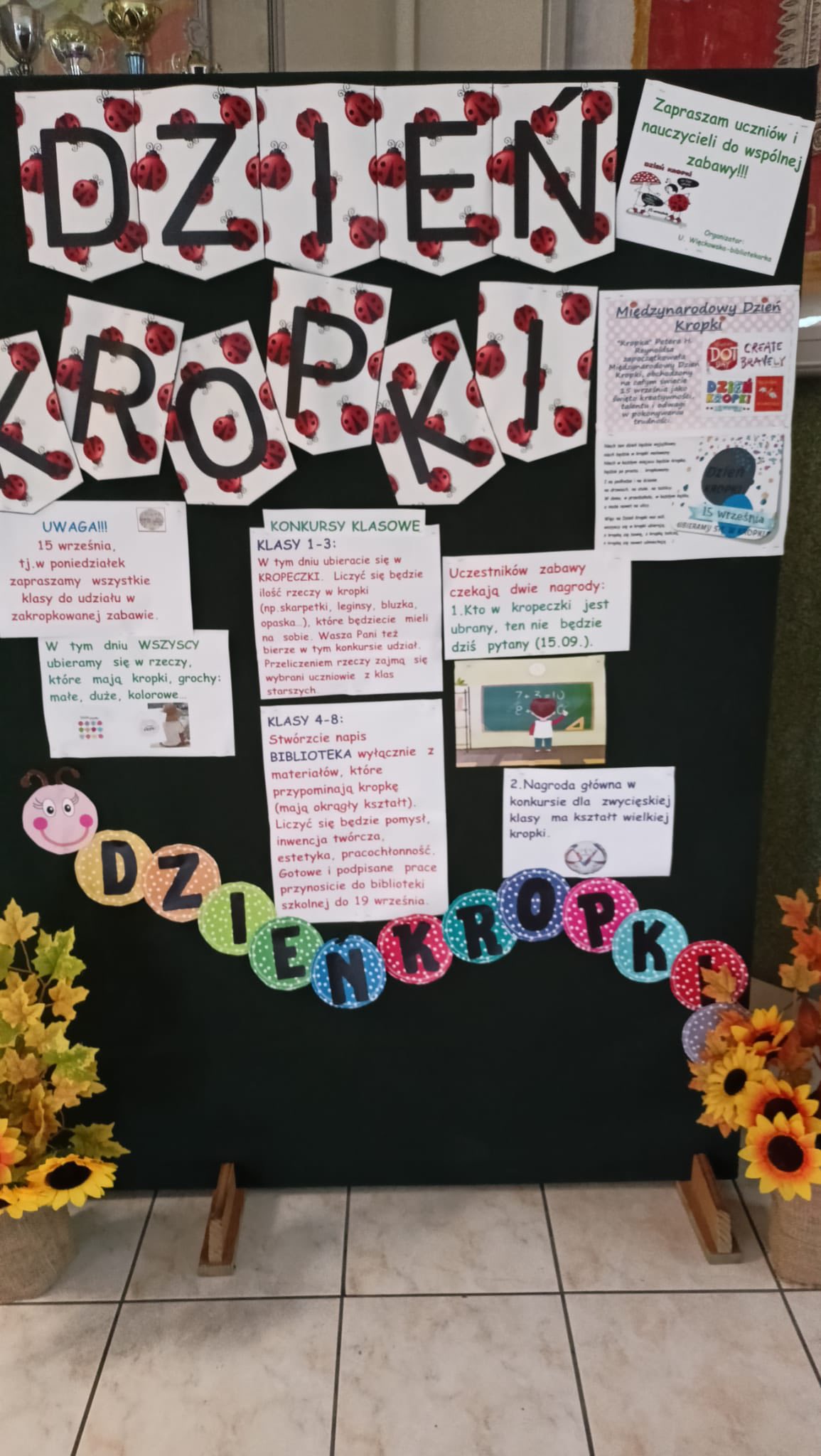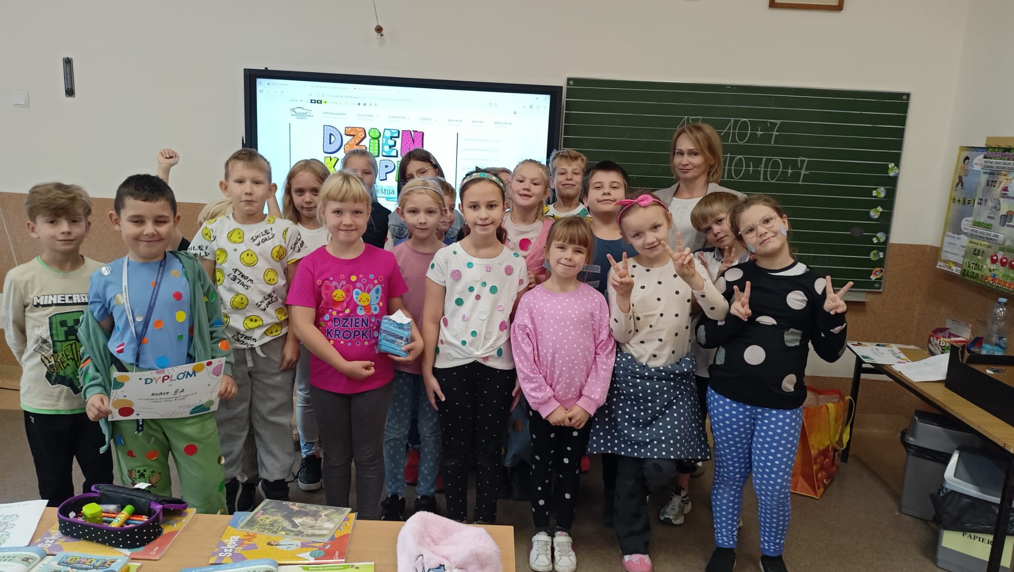Kropki, kropeczki...duże, małe, kolorowe zdobiły dzisiaj- 15 września- ubrania naszych uczniów i nauczycieli. Każdy mógł się utożsamić z bohaterką książki ,,The Dot" czyli ,,Kropka", która dzięki malutkiej kropce i wspaniałej nauczycielce uwierzyła w swoje możliwości. W atmosferze dobrej zabawy odkrywaliśmy swoje mocne strony, powstały kropkowe dzieła sztuki. Gratulujemy klasie 1.B, która w konkursie na najbardziej zakropkowaną klasę zdobyła pierwsze miejsce.