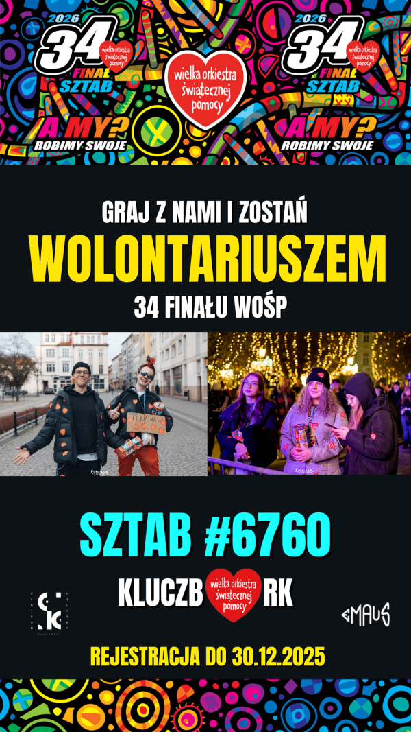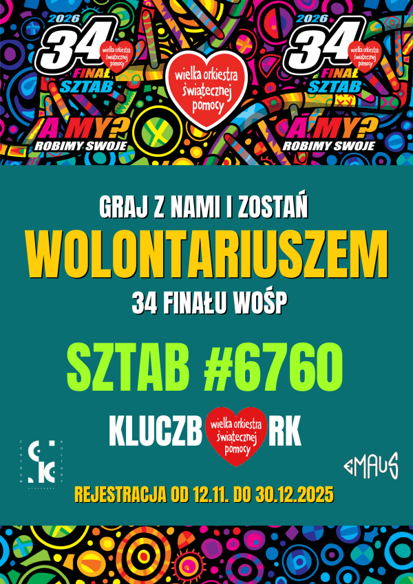 Jako Centrum Kultury w Kluczborku oraz Stowarzyszenie Rozwoju Kultury i Profilaktyki „Emaus”, z radością informujemy, że po raz kolejny organizujemy Finał Wielkiej Orkiestry Świątecznej Pomocy, który odbędzie się 25 stycznia 2026 roku na kluczborskim rynku